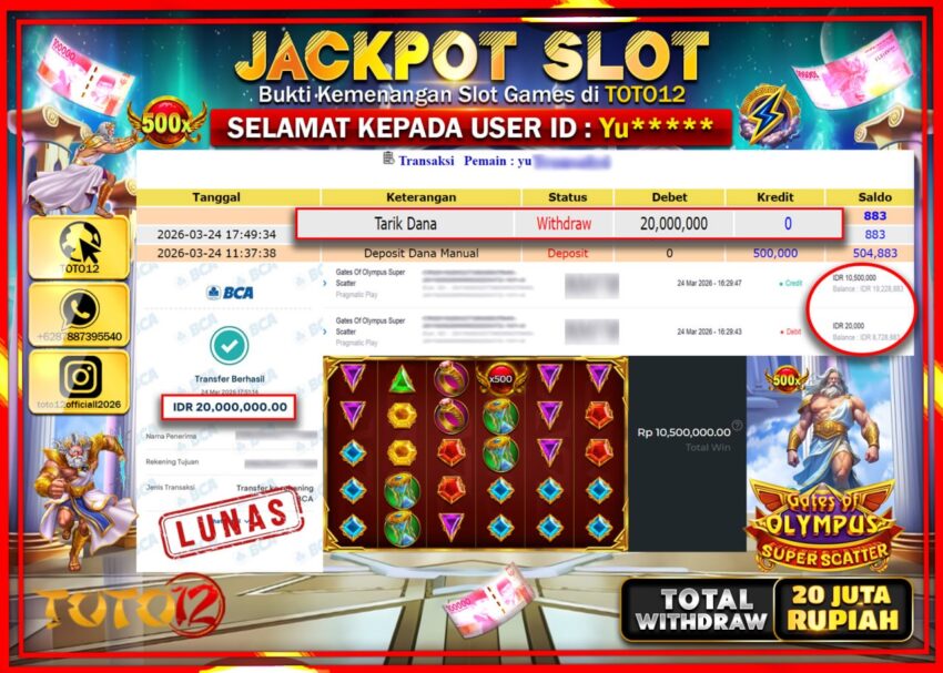 Selamat kepada Member Kami Yu**** Telah Jackpot dan berhasil mendapatkan kemenangan besar pada permainan JACKPOT SLOT GAME (GATES OF OLYMPUS SUPER SCATTER) Dengan Kemenangan Sebesar Rp.20.000.000–.