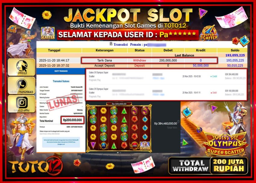 Selamat kepada Member Kami Pa****** Telah Jackpot dan berhasil mendapatkan kemenangan besar pada permainan JACKPOT SLOT GAME (GATES OF OLYMPUS SUPER SCATTER) Dengan Kemenangan Sebesar Rp.200.000.000 –. Setelah mengisi Fomulir Withdraw dengan Kurang waktu 1-2 Menit Dana sudah kami Trasnfer kepada Pemilik Userid dan dana sudah dapat di cairkan oleh pemenang. Bukti Pembayaran yang TOTO12 berikan merupakan Bukti Pembayaran yang SAH / VALID yang langsung Di dapatkan melalui transaksi dari Bank yang di Tunju.