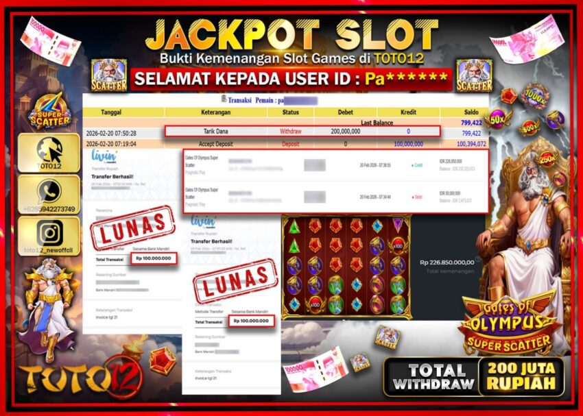 HANYA DI TOTO12 JP PASTI DI BAYAR LUNAS DAN CEPAT!!!!!! JACKPOT SLOT GAME (GATES OF OLYMPUS SUPER SCATTER) Rp.200.000.000!!!!