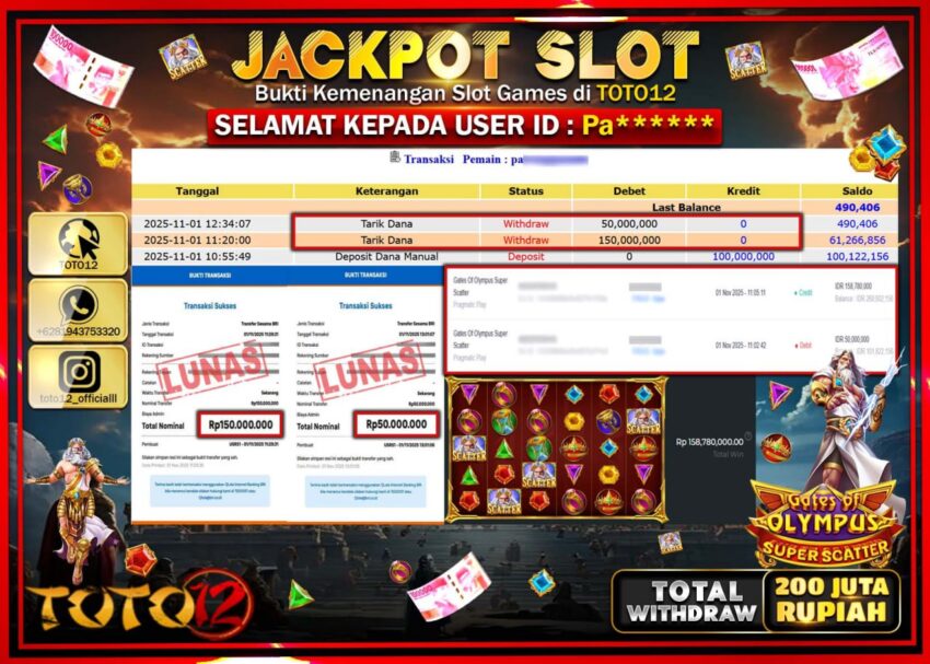 Selamat kepada Member Kami Pa****** Telah Jackpot dan berhasil mendapatkan kemenangan besar pada permainan JACKPOT SLOT GAME (GATES OF OLYMPUS SUPER SCATTER)  Dengan Kemenangan Sebesar Rp.200.000.000 –.  Setelah mengisi Fomulir Withdraw dengan Kurang waktu 1-2 Menit Dana sudah kami Trasnfer kepada Pemilik Userid dan dana sudah dapat di cairkan oleh pemenang. Bukti Pembayaran yang TOTO12 berikan merupakan Bukti Pembayaran yang  SAH / VALID yang langsung Di dapatkan melalui transaksi dari Bank yang di Tunju.