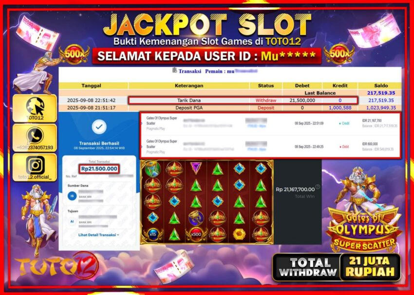 Selamat kepada Member Kami Mu****** Telah Jackpot dan berhasil mendapatkan kemenangan besar pada permainan JACKPOT SLOT GAME (GATES OF OLYMPUS SUPER SCATTER) Dengan Kemenangan Sebesar Rp.21.500.000 –. Setelah mengisi Fomulir Withdraw dengan Kurang waktu 1-2 Menit Dana sudah kami Trasnfer kepada Pemilik Userid dan dana sudah dapat di cairkan oleh pemenang. Bukti Pembayaran yang TOTO12 berikan merupakan Bukti Pembayaran yang SAH / VALID yang langsung Di dapatkan melalui transaksi dari Bank yang di Tunju.
