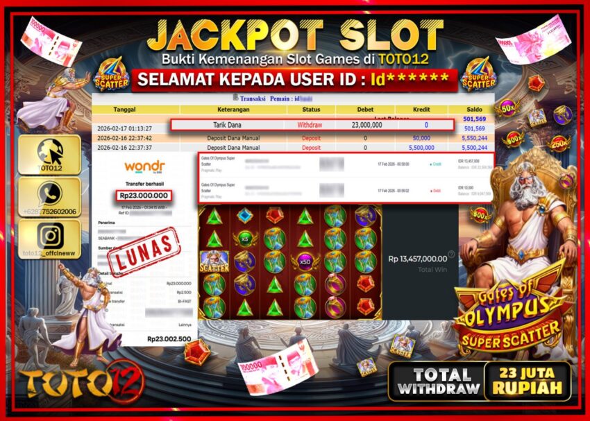 HANYA DI TOTO12 JP PASTI DI BAYAR LUNAS DAN CEPAT!!!!!! JACKPOT SLOT GAME (GATES OF OLYMPUS SUPER SCATTER ) Rp.23..000.000!!!!