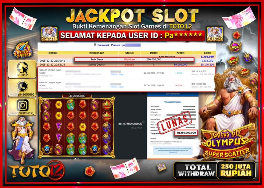 HANYA DI TOTO12 JP PASTI DI BAYAR LUNAS DAN CEPAT!!!!!! JACKPOT SLOT GAME (GATES OF OLYMPUS SUPER SCATTER) Rp.250.000.000 !!!!