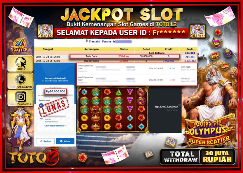 Selamat kepada Member Kami Fr****** Telah Jackpot dan berhasil mendapatkan kemenangan besar pada permainan JACKPOT SLOT GAME (GATES OF OLYMPUS SUPER SCATTER) Dengan Kemenangan Sebesar Rp.30.000.000 –.