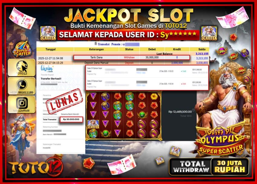 Selamat kepada Member Kami Sy****** Telah Jackpot dan berhasil mendapatkan kemenangan besar pada permainan JACKPOT SLOT GAME (GATES OF OLYMPUS SUPER SCATTER) Dengan Kemenangan Sebesar Rp.30.000.000 –.