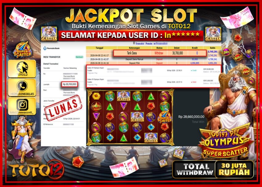 Selamat kepada Member Kami In***** Telah Jackpot dan berhasil mendapatkan kemenangan besar pada permainan JACKPOT SLOT GAME (GATES OF OLYMPUS SUPER SCATTER) Dengan Kemenangan Sebesar Rp.30.700.000–.