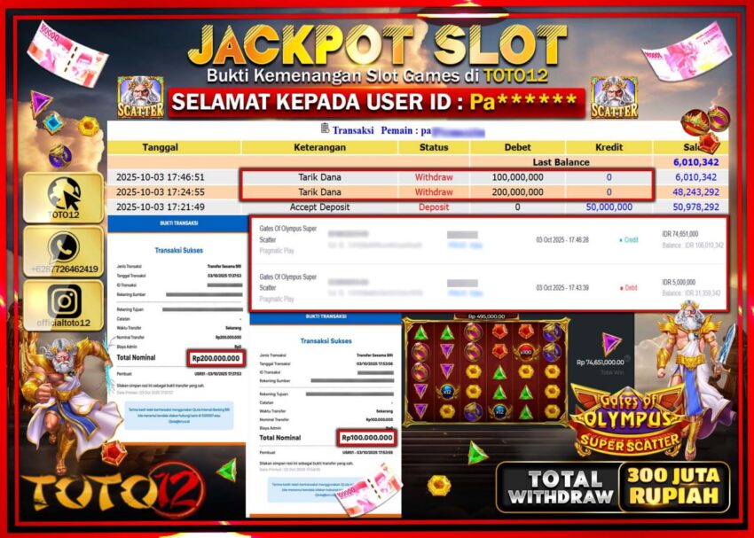 Selamat kepada Member Kami Pa****** Telah Jackpot dan berhasil mendapatkan kemenangan besar pada permainan JACKPOT SLOT GAME (GATES OF OLYMPUS SUPER SCATTER) Dengan Kemenangan Sebesar Rp.300.000.000 –. Setelah mengisi Fomulir Withdraw dengan Kurang waktu 1-2 Menit Dana sudah kami Trasnfer kepada Pemilik Userid dan dana sudah dapat di cairkan oleh pemenang. Bukti Pembayaran yang TOTO12 berikan merupakan Bukti Pembayaran yang SAH / VALID yang langsung Di dapatkan melalui transaksi dari Bank yang di Tunju.