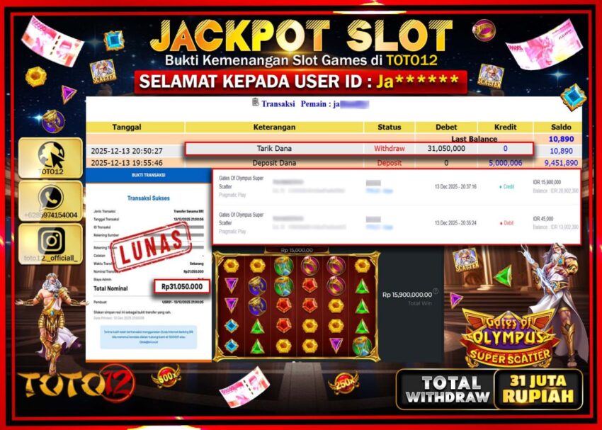 HANYA DI TOTO12 JP PASTI DI BAYAR LUNAS DAN CEPAT!!!!!! JACKPOT SLOT GAME (GATES OF OLYMPUS SUPER SCATTER) Rp.31.050.000 !!!!