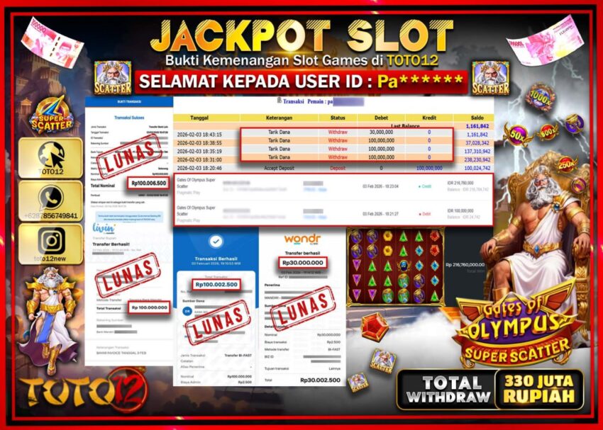 Selamat kepada Member Kami Pa****** Telah Jackpot dan berhasil mendapatkan kemenangan besar pada permainan JACKPOT SLOT GAME (GATES OF OLYMPUS SUPER SCATTER) Dengan Kemenangan Sebesar Rp.330.000.000 –.