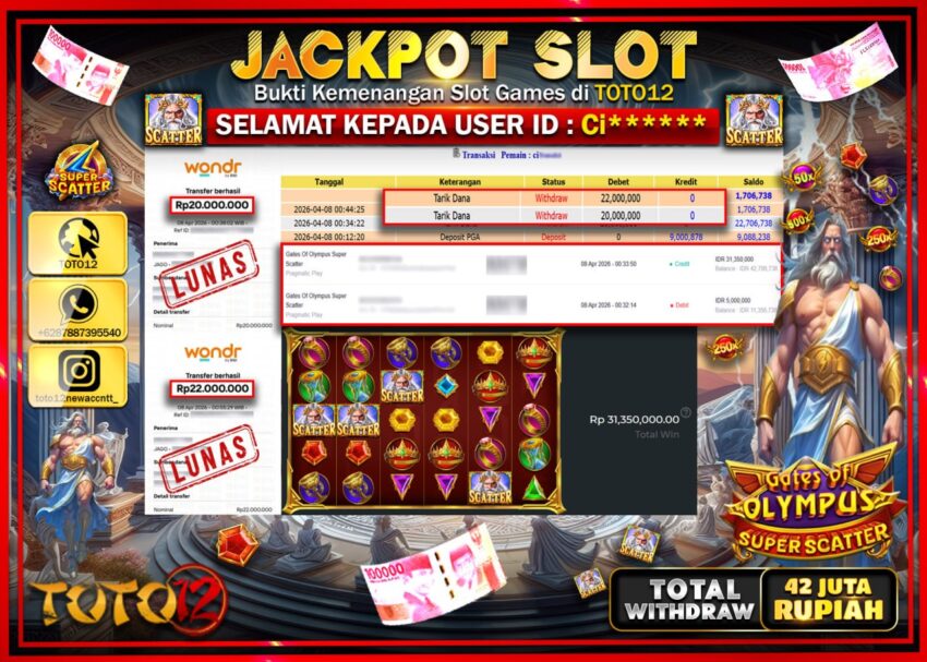 Selamat kepada Member Kami Ci***** Telah Jackpot dan berhasil mendapatkan kemenangan besar pada permainan JACKPOT SLOT GAME (GATES OF OLYMPUS SUPER SCATTER) Dengan Kemenangan Sebesar Rp.42.000.000–.