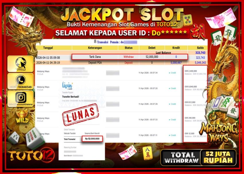 HANYA DI TOTO12 JP PASTI DI BAYAR LUNAS DAN CEPAT!!!!!! JACKPOT SLOT GAME (MAHJONG WAYS) Rp.52.000.000!!!!