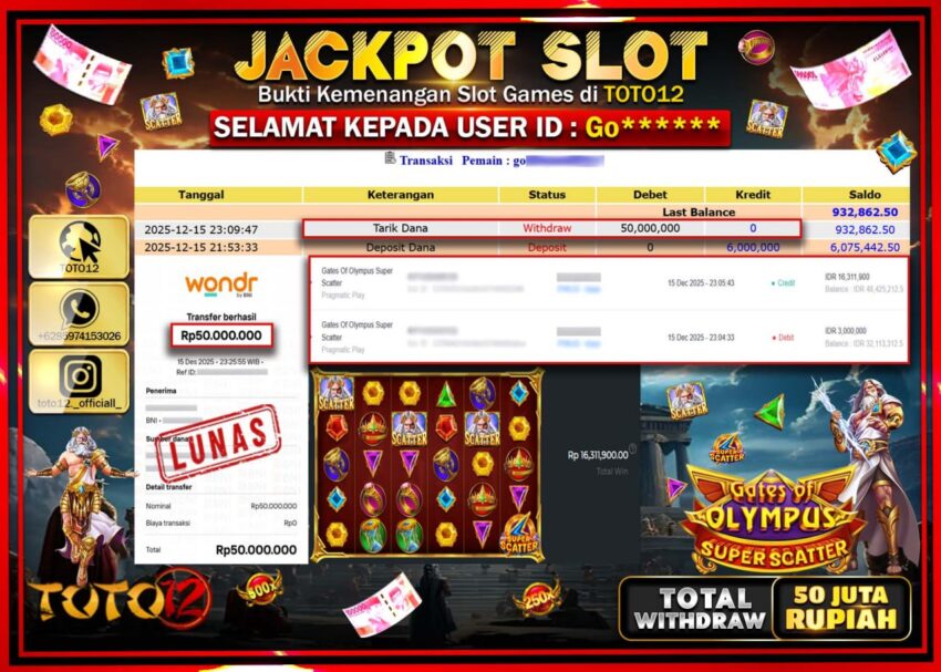 Selamat kepada Member Kami Go****** Telah Jackpot dan berhasil mendapatkan kemenangan besar pada permainan JACKPOT SLOT GAME (GATES OF OLYMPUS SUPER SCATTER) Dengan Kemenangan Sebesar Rp.50.000.000 –.