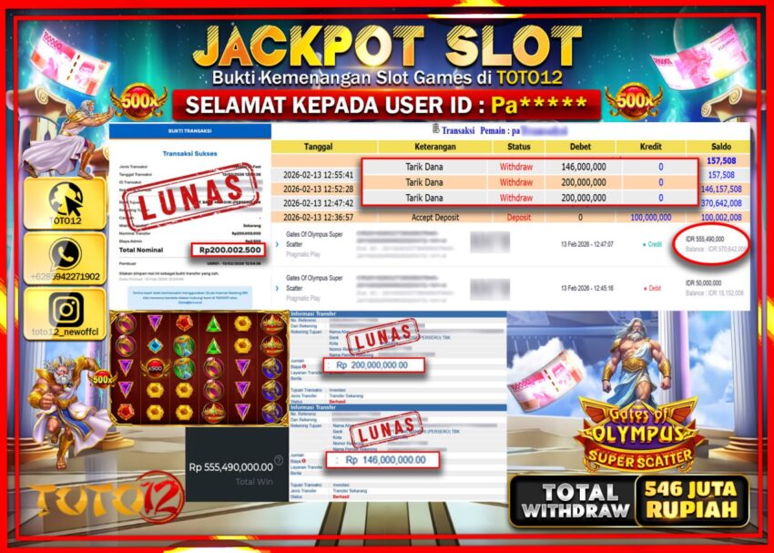 HANYA DI TOTO12 JP PASTI DI BAYAR LUNAS DAN CEPAT!!!!!! JACKPOT SLOT GAME (GATES OF OLYMPUS SUPER SCATTER) Rp.546.000.000!!!!