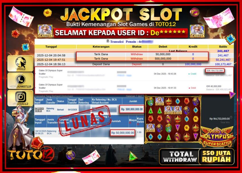 Selamat kepada Member Kami De****** Telah Jackpot dan berhasil mendapatkan kemenangan besar pada permainan JACKPOT SLOT GAME (GATES OF OLYMPUS SUPER SCATTER) Dengan Kemenangan Sebesar Rp.550.000.000 –.