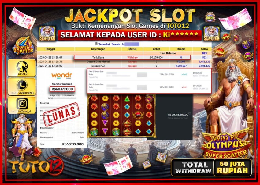Selamat kepada Member Kami Ki***** Telah Jackpot dan berhasil mendapatkan kemenangan besar pada permainan JACKPOT SLOT GAME (GATES OF OLYMPUS SUPER SCATTER) Dengan Kemenangan Sebesar Rp.60.179.000–.