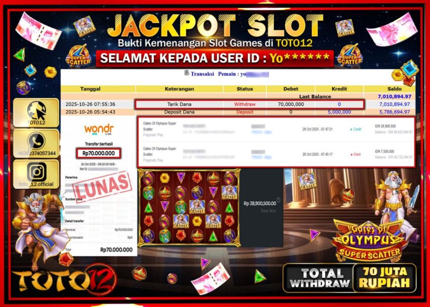 Selamat kepada Member Kami Yo****** Telah Jackpot dan berhasil mendapatkan kemenangan besar pada permainan JACKPOT SLOT GAME (GATES OF OLYMPUS SUPER SCATTER) Dengan Kemenangan Sebesar Rp.70.000.000 –. Setelah mengisi Fomulir Withdraw dengan Kurang waktu 1-2 Menit Dana sudah kami Trasnfer kepada Pemilik Userid dan dana sudah dapat di cairkan oleh pemenang. Bukti Pembayaran yang TOTO12 berikan merupakan Bukti Pembayaran yang SAH / VALID yang langsung Di dapatkan melalui transaksi dari Bank yang di Tunju.