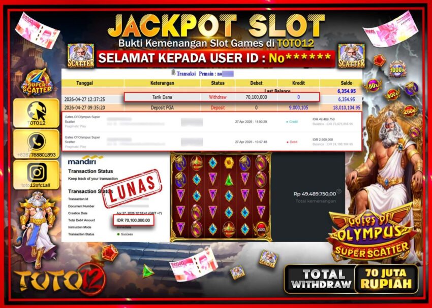 Selamat kepada Member Kami No***** Telah Jackpot dan berhasil mendapatkan kemenangan besar pada permainan JACKPOT SLOT GAME (GATES OF OLYMPUS SUPER SCATTER) Dengan Kemenangan Sebesar Rp.70.100.000–.