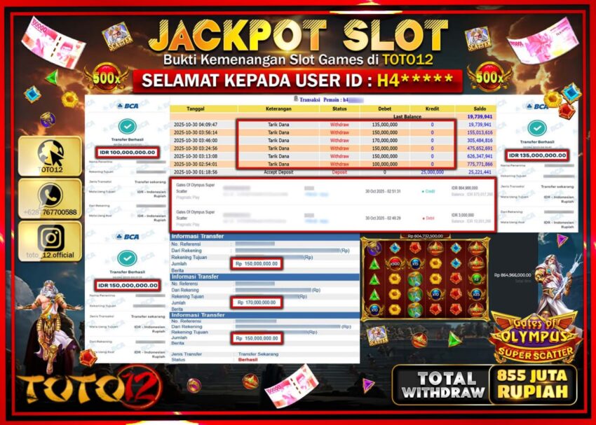Selamat kepada Member Kami H4****** Telah Jackpot dan berhasil mendapatkan kemenangan besar pada permainan JACKPOT SLOT GAME (GATES OF OLYMPUS SUPER SCATTER) Dengan Kemenangan Sebesar Rp.855.000.000 –. Setelah mengisi Fomulir Withdraw dengan Kurang waktu 1-2 Menit Dana sudah kami Trasnfer kepada Pemilik Userid dan dana sudah dapat di cairkan oleh pemenang. Bukti Pembayaran yang TOTO12 berikan merupakan Bukti Pembayaran yang SAH / VALID yang langsung Di dapatkan melalui transaksi dari Bank yang di Tunju.