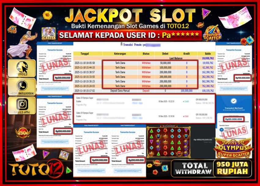 Selamat kepada Member Kami Pa****** Telah Jackpot dan berhasil mendapatkan kemenangan besar pada permainan JACKPOT SLOT GAME (GATES OF OLYMPUS SUPER SCATTER) Dengan Kemenangan Sebesar Rp.950.000.000 –. Setelah mengisi Fomulir Withdraw dengan Kurang waktu 1-2 Menit Dana sudah kami Trasnfer kepada Pemilik Userid dan dana sudah dapat di cairkan oleh pemenang. Bukti Pembayaran yang TOTO12 berikan merupakan Bukti Pembayaran yang SAH / VALID yang langsung Di dapatkan melalui transaksi dari Bank yang di Tunju.