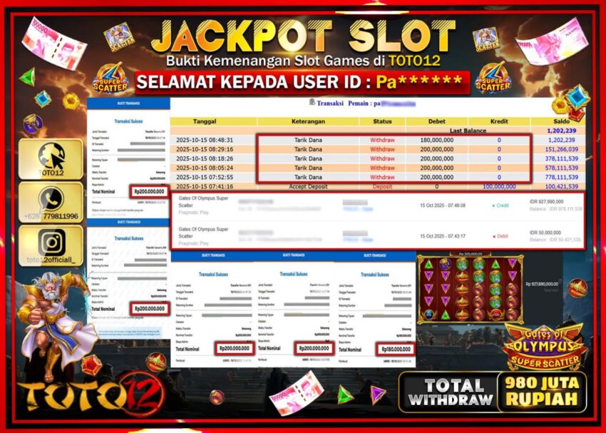 Selamat kepada Member Kami Pa****** Telah Jackpot dan berhasil mendapatkan kemenangan besar pada permainan JACKPOT SLOT GAME (GATES OF OLYMPUS SUPER SCATTER)  Dengan Kemenangan Sebesar Rp.980.000.000 –.  Setelah mengisi Fomulir Withdraw dengan Kurang waktu 1-2 Menit Dana sudah kami Trasnfer kepada Pemilik Userid dan dana sudah dapat di cairkan oleh pemenang. Bukti Pembayaran yang TOTO12 berikan merupakan Bukti Pembayaran yang  SAH / VALID yang langsung Di dapatkan melalui transaksi dari Bank yang di Tunju.