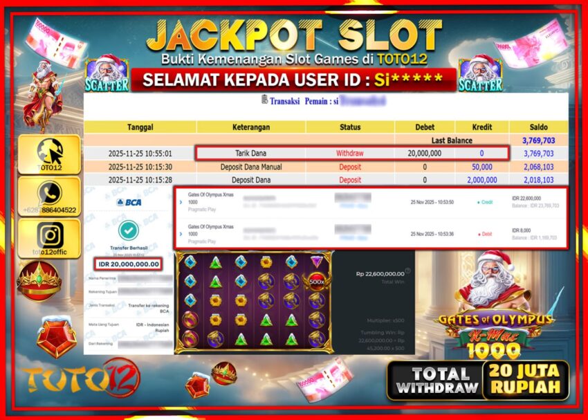 Selamat kepada Member Kami Si****** Telah Jackpot dan berhasil mendapatkan kemenangan besar pada permainan JACKPOT SLOT GAME (GATES OF OLYMPUS XMAS 1000) Dengan Kemenangan Sebesar Rp.20.000.000 –.