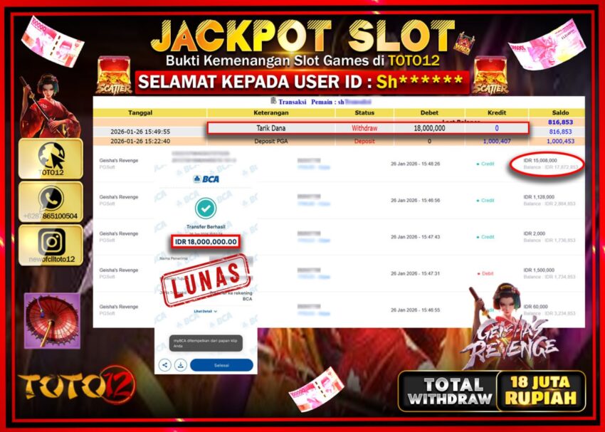 Selamat kepada Member Kami Sh****** Telah Jackpot dan berhasil mendapatkan kemenangan besar pada permainan JACKPOT SLOT GAME (GEISHAS REVENGE)  Dengan Kemenangan Sebesar Rp.18.000.000 –.