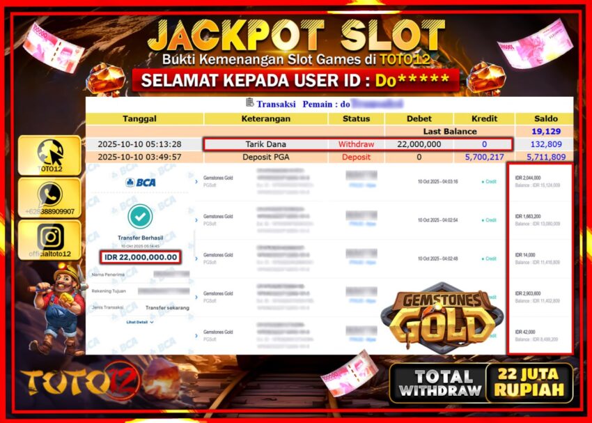 Selamat kepada Member Kami Do****** Telah Jackpot dan berhasil mendapatkan kemenangan besar pada permainan JACKPOT SLOT GAME (GEMSTONES GOLD)  Dengan Kemenangan Sebesar Rp.22.000.000 –.  Setelah mengisi Fomulir Withdraw dengan Kurang waktu 1-2 Menit Dana sudah kami Trasnfer kepada Pemilik Userid dan dana sudah dapat di cairkan oleh pemenang. Bukti Pembayaran yang TOTO12 berikan merupakan Bukti Pembayaran yang  SAH / VALID yang langsung Di dapatkan melalui transaksi dari Bank yang di Tunju.