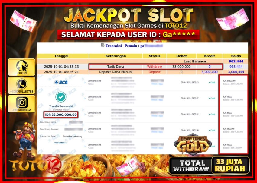 Selamat kepada Member Kami Ga****** Telah Jackpot dan berhasil mendapatkan kemenangan besar pada permainan JACKPOT SLOT GAME (GEMSTONES GOLD) Dengan Kemenangan Sebesar Rp.33.000.000 –. Setelah mengisi Fomulir Withdraw dengan Kurang waktu 1-2 Menit Dana sudah kami Trasnfer kepada Pemilik Userid dan dana sudah dapat di cairkan oleh pemenang. Bukti Pembayaran yang TOTO12 berikan merupakan Bukti Pembayaran yang SAH / VALID yang langsung Di dapatkan melalui transaksi dari Bank yang di Tunju.