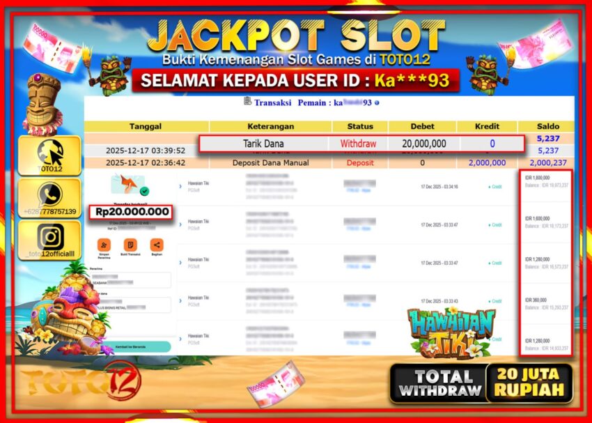 Selamat kepada Member Kami Ka****** Telah Jackpot dan berhasil mendapatkan kemenangan besar pada permainan JACKPOT SLOT GAME (HAWAIIAN TIKI) Dengan Kemenangan Sebesar Rp.20.000.000 –.