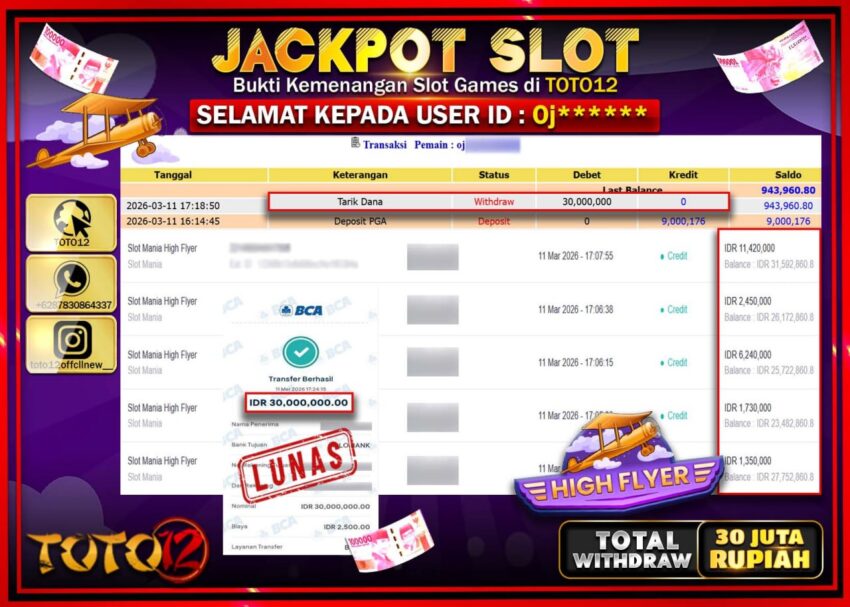 Selamat kepada Member Kami 0J****** Telah Jackpot dan berhasil mendapatkan kemenangan besar pada permainan JACKPOT SLOT GAME (HIGH FLYER) Dengan Kemenangan Sebesar Rp.30.000.000–.