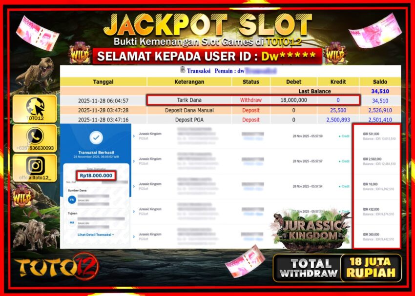 Selamat kepada Member Kami Dw****** Telah Jackpot dan berhasil mendapatkan kemenangan besar pada permainan JACKPOT SLOT GAME (JURASSIC KINGDOM) Dengan Kemenangan Sebesar Rp.18.000.000 –.
