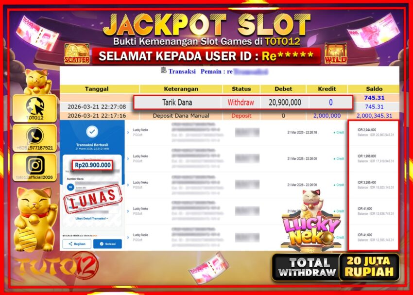 Selamat kepada Member Kami Re**** Telah Jackpot dan berhasil mendapatkan kemenangan besar pada permainan JACKPOT SLOT GAME (LUCK NEKO) Dengan Kemenangan Sebesar Rp.20.900.000–.