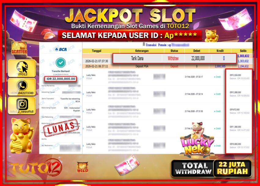 Selamat kepada Member Kami Ap**** Telah Jackpot dan berhasil mendapatkan kemenangan besar pada permainan JACKPOT SLOT GAME (LUCK NEKO) Dengan Kemenangan Sebesar Rp.22.000.000–.