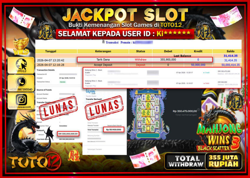 Selamat kepada Member Kami Ki***** Telah Jackpot dan berhasil mendapatkan kemenangan besar pada permainan JACKPOT SLOT GAME (MAHJONG 3 WINS BLACK SCATTER) Dengan Kemenangan Sebesar Rp.355.900.000–.