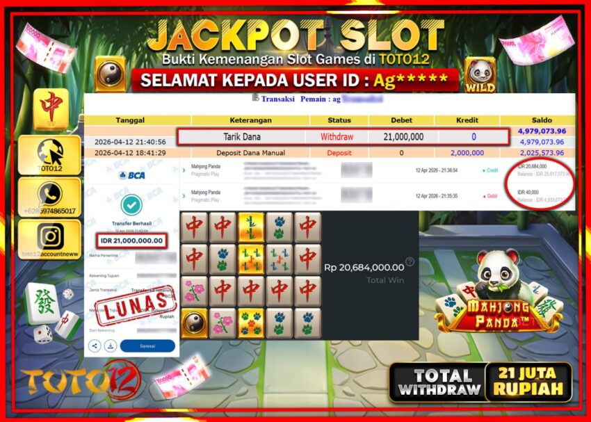 Selamat kepada Member Kami Ag***** Telah Jackpot dan berhasil mendapatkan kemenangan besar pada permainan JACKPOT SLOT GAME (MAHJONG PANDA) Dengan Kemenangan Sebesar Rp.21.000.000–.