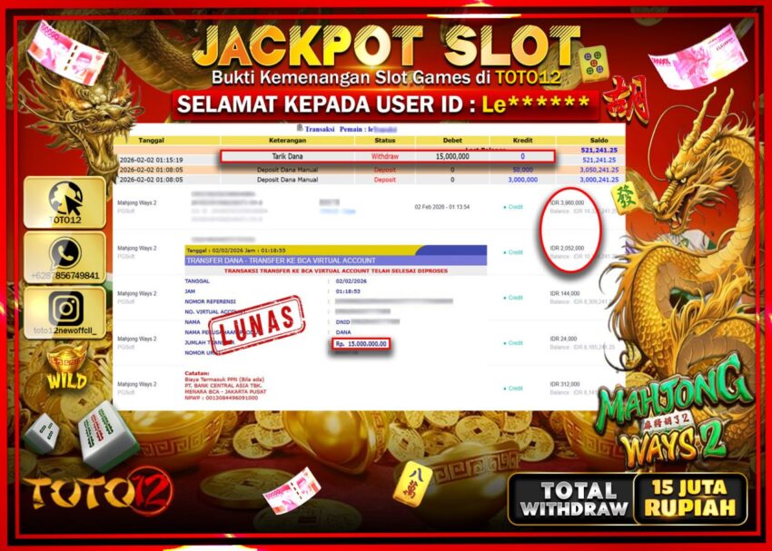 Selamat kepada Member Kami Le****** Telah Jackpot dan berhasil mendapatkan kemenangan besar pada permainan JACKPOT SLOT GAME (MAHJONG WAYS 2)  Dengan Kemenangan Sebesar Rp.15.000.000 –.