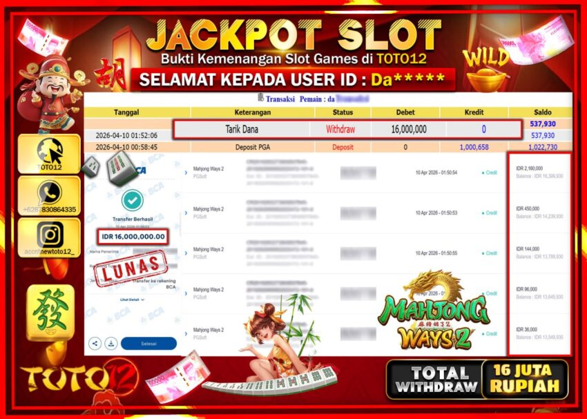 Selamat kepada Member Kami Da***** Telah Jackpot dan berhasil mendapatkan kemenangan besar pada permainan JACKPOT SLOT GAME (MAHJONG WAYS 2) Dengan Kemenangan Sebesar Rp.16.000.000–.