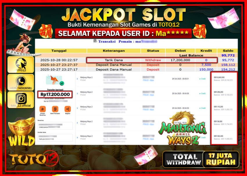 Selamat kepada Member Kami Ma****** Telah Jackpot dan berhasil mendapatkan kemenangan besar pada permainan JACKPOT SLOT GAME (MAHJONG WAYS 2) Dengan Kemenangan Sebesar Rp.17.200.000 –. Setelah mengisi Fomulir Withdraw dengan Kurang waktu 1-2 Menit Dana sudah kami Trasnfer kepada Pemilik Userid dan dana sudah dapat di cairkan oleh pemenang. Bukti Pembayaran yang TOTO12 berikan merupakan Bukti Pembayaran yang SAH / VALID yang langsung Di dapatkan melalui transaksi dari Bank yang di Tunju.