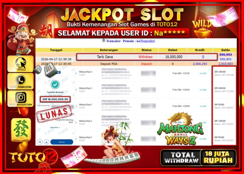 Selamat kepada Member Kami Na***** Telah Jackpot dan berhasil mendapatkan kemenangan besar pada permainan JACKPOT SLOT GAME (MAHJONG WAYS 2) Dengan Kemenangan Sebesar Rp.18.000.000–.
