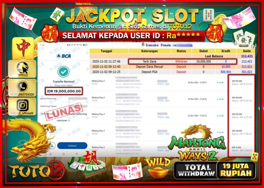 Selamat kepada Member Kami Ra****** Telah Jackpot dan berhasil mendapatkan kemenangan besar pada permainan JACKPOT SLOT GAME (MAHJONG WAYS 2)  Dengan Kemenangan Sebesar Rp.19.000.000 –.  Setelah mengisi Fomulir Withdraw dengan Kurang waktu 1-2 Menit Dana sudah kami Trasnfer kepada Pemilik Userid dan dana sudah dapat di cairkan oleh pemenang. Bukti Pembayaran yang TOTO12 berikan merupakan Bukti Pembayaran yang  SAH / VALID yang langsung Di dapatkan melalui transaksi dari Bank yang di Tunju.