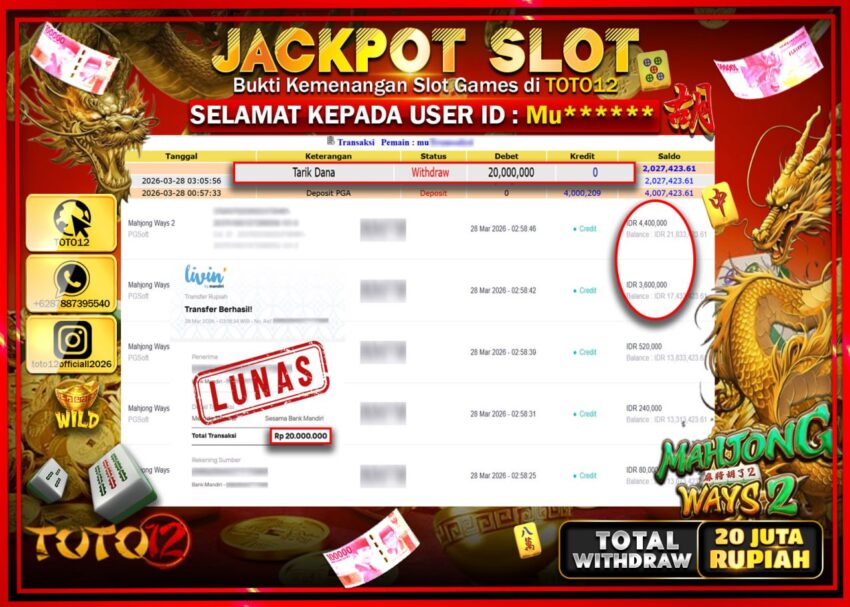 Selamat kepada Member Kami Mu***** Telah Jackpot dan berhasil mendapatkan kemenangan besar pada permainan JACKPOT SLOT GAME  (MAHJONG WAYS 2)  Dengan Kemenangan Sebesar Rp.20.000.000–.