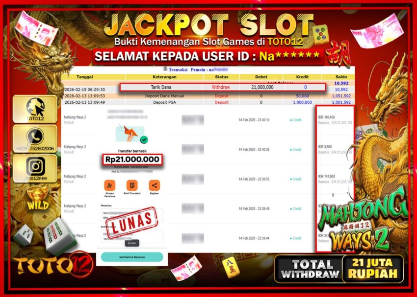 Selamat kepada Member Kami Na****** Telah Jackpot dan berhasil mendapatkan kemenangan besar pada permainan JACKPOT SLOT GAME (MAHJONG WAYS 2) Dengan Kemenangan Sebesar Rp.21.000.000–.