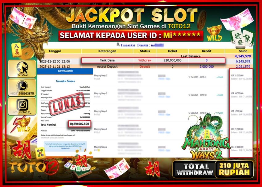 Selamat kepada Member Kami Mi****** Telah Jackpot dan berhasil mendapatkan kemenangan besar pada permainan JACKPOT SLOT GAME (MAHJONG WAYS 2) Dengan Kemenangan Sebesar Rp.210.000.000 –.