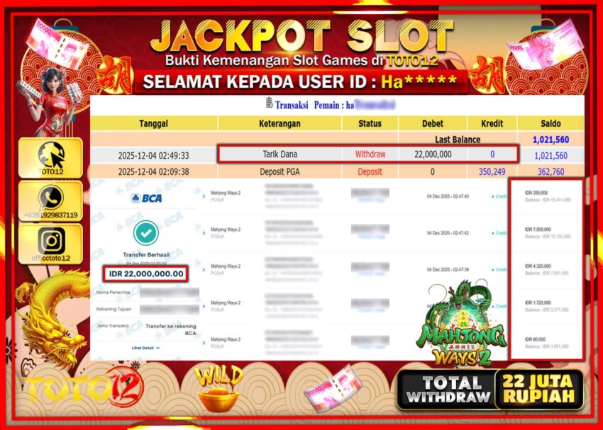 Selamat kepada Member Kami Ha****** Telah Jackpot dan berhasil mendapatkan kemenangan besar pada permainan JACKPOT SLOT GAME (MAHJONG WAYS 2) Dengan Kemenangan Sebesar Rp.22.000.000 –.