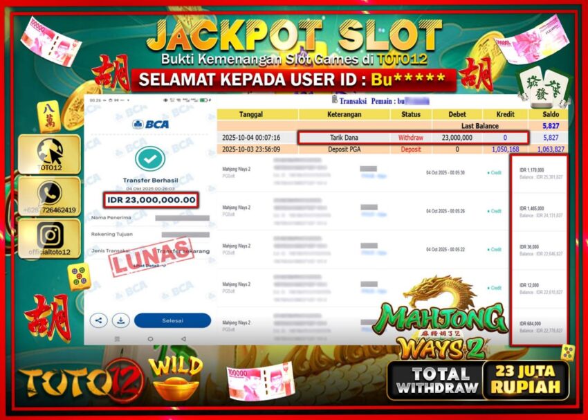 Selamat kepada Member Kami Bu****** Telah Jackpot dan berhasil mendapatkan kemenangan besar pada permainan JACKPOT SLOT GAME (MAHJONG WAYS 2)  Dengan Kemenangan Sebesar Rp.23.000.000 –.  Setelah mengisi Fomulir Withdraw dengan Kurang waktu 1-2 Menit Dana sudah kami Trasnfer kepada Pemilik Userid dan dana sudah dapat di cairkan oleh pemenang. Bukti Pembayaran yang TOTO12 berikan merupakan Bukti Pembayaran yang  SAH / VALID yang langsung Di dapatkan melalui transaksi dari Bank yang di Tunju.