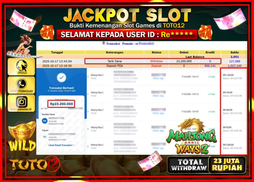 Selamat kepada Member Kami Re****** Telah Jackpot dan berhasil mendapatkan kemenangan besar pada permainan JACKPOT SLOT GAME (MAHJONG WAYS 2) Dengan Kemenangan Sebesar Rp.23.200.000 –. Setelah mengisi Fomulir Withdraw dengan Kurang waktu 1-2 Menit Dana sudah kami Trasnfer kepada Pemilik Userid dan dana sudah dapat di cairkan oleh pemenang. Bukti Pembayaran yang TOTO12 berikan merupakan Bukti Pembayaran yang SAH / VALID yang langsung Di dapatkan melalui transaksi dari Bank yang di Tunju.