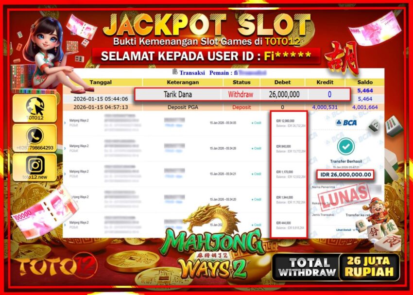 HANYA DI TOTO12 JP PASTI DI BAYAR LUNAS DAN CEPAT!!!!!! JACKPOT SLOT GAME (MAHJONG WAYS 2) Rp.26.000.000 !!!!