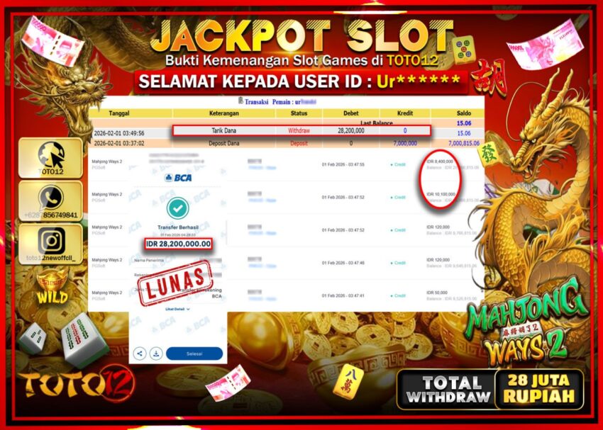 HANYA DI TOTO12 JP PASTI DI BAYAR LUNAS DAN CEPAT!!!!!! JACKPOT SLOT GAME (MAHJONG WAYS 2 ) Rp.28.200.000 !!!!