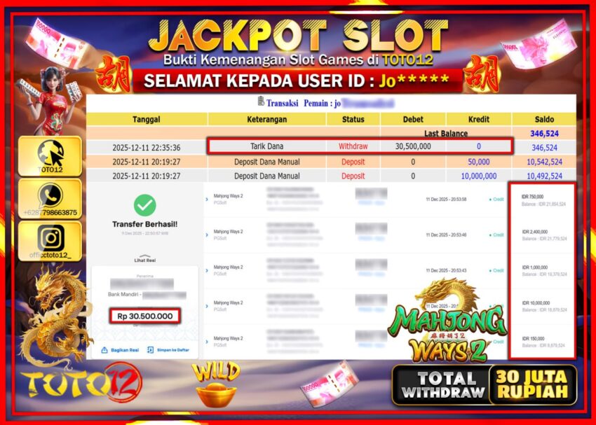 Selamat kepada Member Kami Jo****** Telah Jackpot dan berhasil mendapatkan kemenangan besar pada permainan JACKPOT SLOT GAME (MAHJONG WAYS 2) Dengan Kemenangan Sebesar Rp.30.500.000 –.