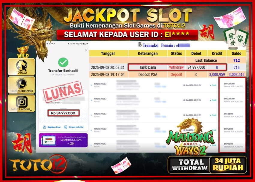 Selamat kepada Member Kami El****** Telah Jackpot dan berhasil mendapatkan kemenangan besar pada permainan JACKPOT SLOT GAME (MAHJONG WAYS 2) Dengan Kemenangan Sebesar Rp.34.997.000 –. Setelah mengisi Fomulir Withdraw dengan Kurang waktu 1-2 Menit Dana sudah kami Trasnfer kepada Pemilik Userid dan dana sudah dapat di cairkan oleh pemenang. Bukti Pembayaran yang TOTO12 berikan merupakan Bukti Pembayaran yang SAH / VALID yang langsung Di dapatkan melalui transaksi dari Bank yang di Tunju.